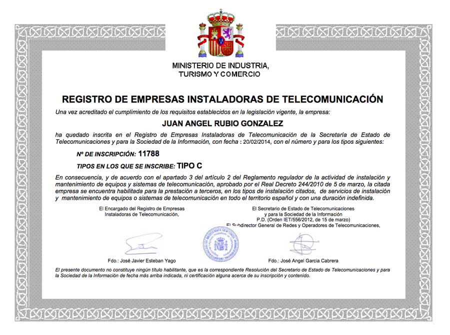 Sonido Juan Ángel está inscrita en el Registro de Empresas Instaladoras de Telecomunicación en el Tipo C de acuerdo con el apartado 3 del artículo 2 del reglamento regulador de la actividad de instalación y mantenimiento de equipos y sistemas de telecomunicación, aprobado por el real decreto 244/2010 de 5 de marzo.